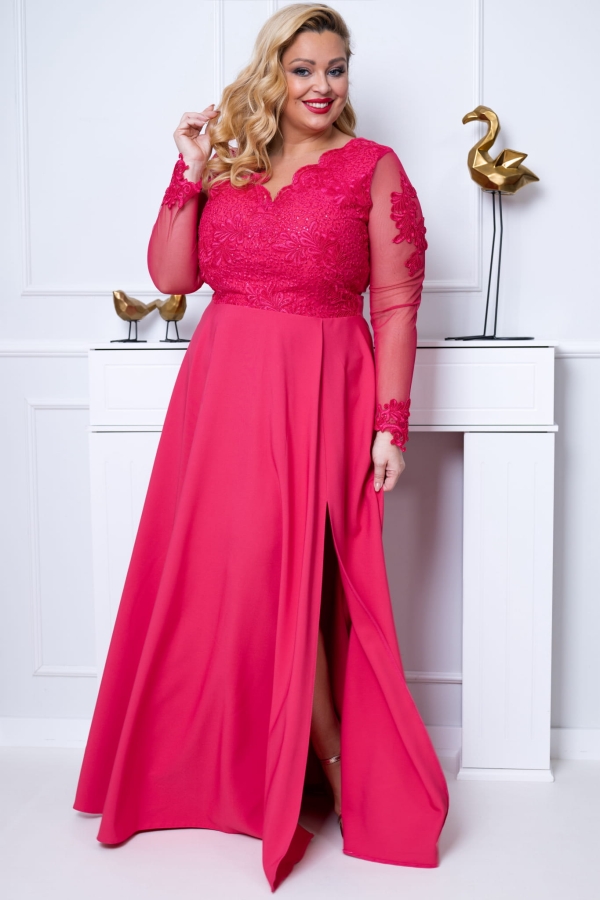 CARMEN II LONG to zjawiskowa długa suknia z rękawem oraz z rozcięciem na nodze z wyjątkowo piękną gipurą. Gipiurowa góra ozdobiona drobnymi cekinkami z długim rękawem. Rękaw uszyty został z elastycznej siateczki ozdobiony oryginalnymi haftowanymi aplikacjami, bardzo komfortowy w noszeniu. Suknię wykonano z eleganckiej lejącej gładkiej tkaniny gabardyny z elastanem. Model wysmuklający, zaprojektowany z myślą dla sylwetek PLUS SIZE