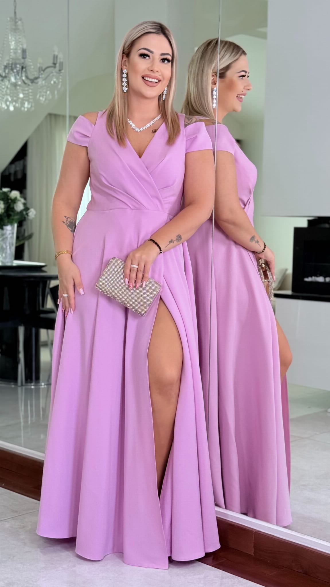 GALA to niezwykle kobieca, wieczorowa długa suknia wykonana z delikatnej, swobodnie układającej się tkaniny. Modny fason podkreślający kobiecą sylwetkę. Efektowne drapowanie z przodu oraz wysmuklający szyję kopertowy dekolt. Lekko opadający na ramię kimonkowy rękawek oraz długie dodające seksapilu pęknięcie na nodze. Wygodna, lekko elastyczna, świetnie dopasowująca się do sylwetki. Model sukni wysmuklający, zaprojektowany z myślą o sylwetkach PLUS SIZE. Suknia występuje w rozmiarach 36-56