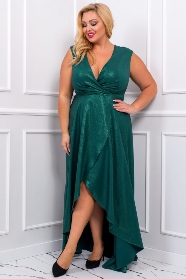 GRACIA to niezwykle kobieca długa suknia wykonana z delikatnej, swobodnie układającej się tkaniny. Modny fason podkreślający kobiecą sylwetkę. Efektowne drapowanie z przodu oraz wysmuklający szyję kopertowy dekolt. Szerokie ramiączko opadające na ramię tworzące mini rękawek oraz długie dodające seksapilu pęknięcie na nodze. Wygodna, lekko elastyczna, świetnie dopasowująca się do sylwetki. Model sukni wysmuklający, zaprojektowany z myślą o sylwetkach PLUS SIZE