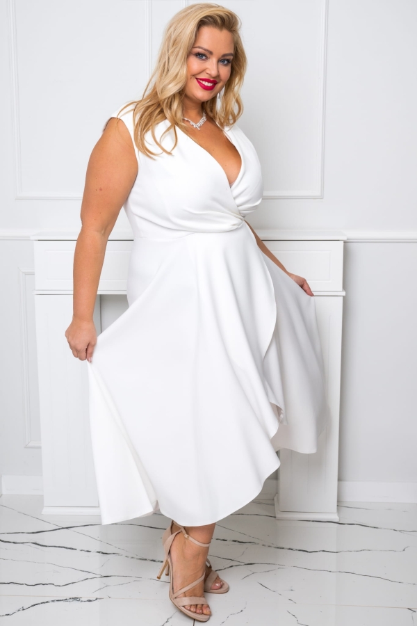 GRETA to niezwykle kobieca sukienka midi wykonana z delikatnej, swobodnie układającej się tkaniny. Modny fason podkreślający kobiecą sylwetkę. Efektowne drapowanie z przodu oraz wysmuklający szyję kopertowy dekolt. Szerokie ramiączko opadające na ramię tworzące mini rękawek oraz długie dodające seksapilu pęknięcie na nodze. Wygodna, lekko elastyczna, świetnie dopasowująca się do sylwetki. Model sukni wysmuklający, zaprojektowany z myślą o sylwetkach PLUS SIZE. Suknia występuje w rozmiarach 36-56