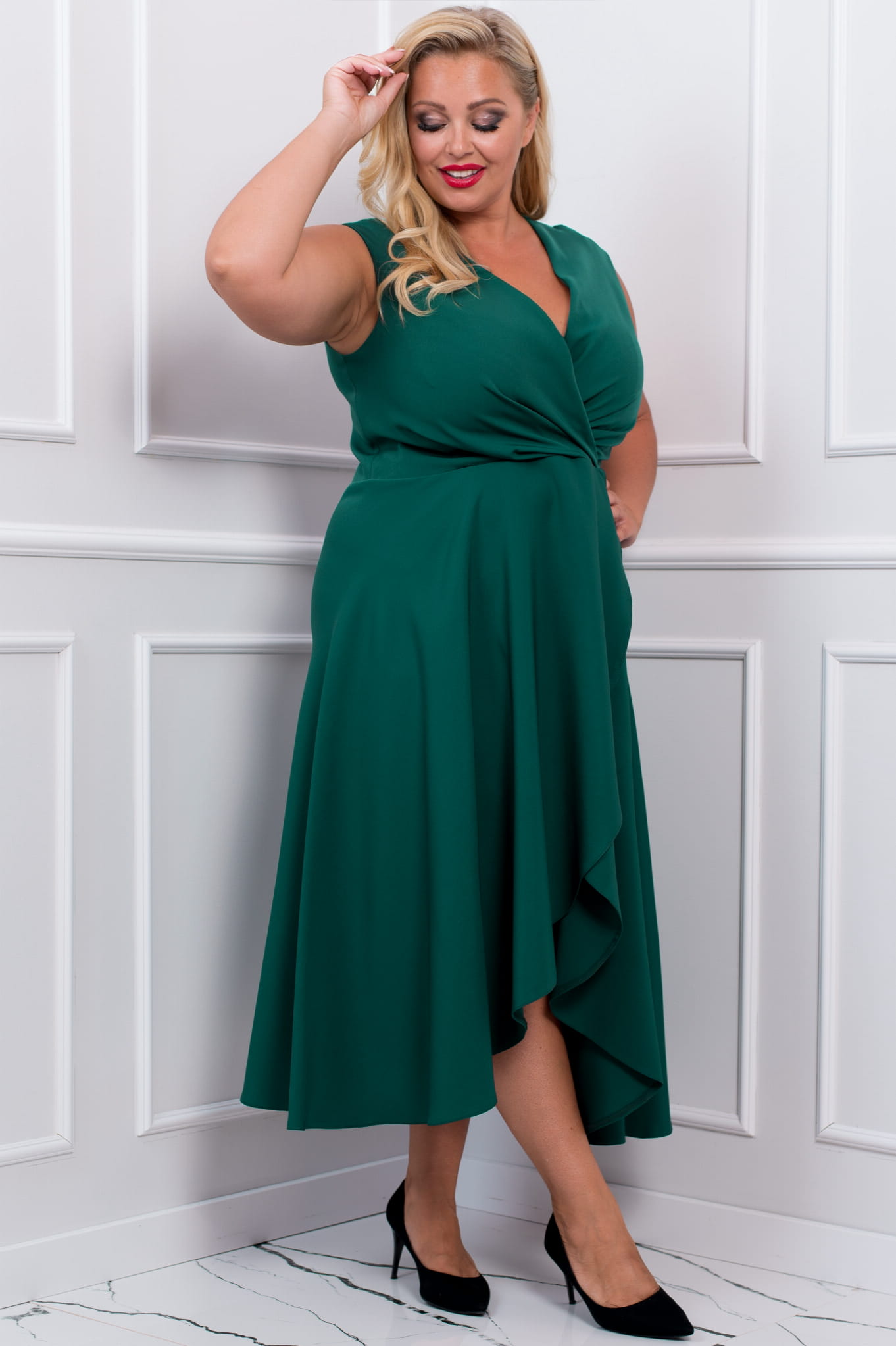 GRETA to niezwykle kobieca sukienka midi wykonana z delikatnej, swobodnie układającej się tkaniny. Modny fason podkreślający kobiecą sylwetkę. Efektowne drapowanie z przodu oraz wysmuklający szyję kopertowy dekolt. Szerokie ramiączko opadające na ramię tworzące mini rękawek oraz długie dodające seksapilu pęknięcie na nodze. Wygodna, lekko elastyczna, świetnie dopasowująca się do sylwetki. Model sukni wysmuklający, zaprojektowany z myślą o sylwetkach PLUS SIZE. Suknia występuje w rozmiarach 36-56