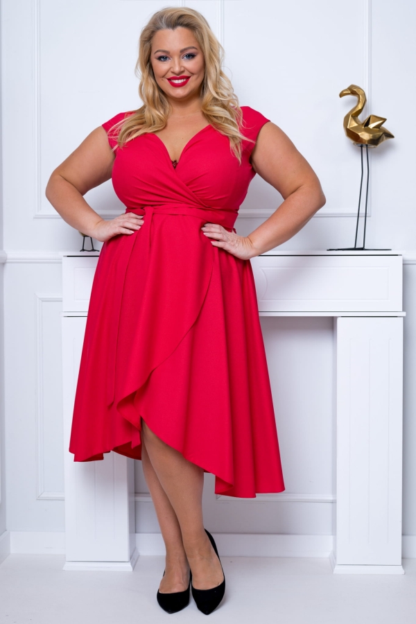 GRETA brocate to niezwykle kobieca sukienka midi wykonana z delikatnej, swobodnie układającej się tkaniny brokatowej. Modny fason podkreślający kobiecą sylwetkę. Efektowne drapowanie z przodu oraz wysmuklający szyję kopertowy dekolt. Szerokie ramiączko opadające na ramię tworzące mini rękawek oraz długie dodające seksapilu pęknięcie na nodze. Wygodna, lekko elastyczna, świetnie dopasowująca się do sylwetki. Model sukni wysmuklający, zaprojektowany z myślą o sylwetkach PLUS SIZE. Suknia występuje w rozmiarach 36-56