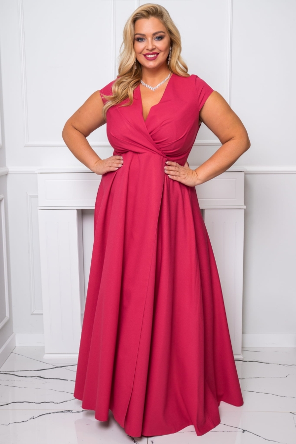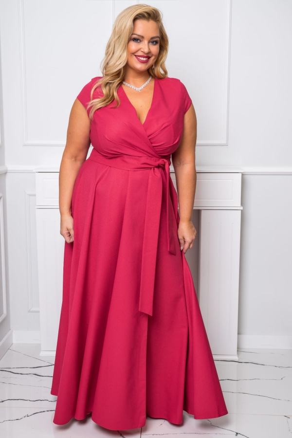 NATALIA z paseczkiem to niezwykle kobieca długa suknia wykonana z ekskluzywnej, lekkiej i połyskującej tkaniny. Modny fason podkreślający kobiecą sylwetkę z rozcięciem na nodze. Efektowne drapowanie z przodu, wysmuklający szyję kopertowy dekolt oraz lekko opadający na ramię rękawek, sprawiają że suknia jest bardzo efektowna i świetnie dopasowuje się do sylwetki. Model sukni wysmuklający, zaprojektowany z myślą o sylwetkach PLUS SIZE.