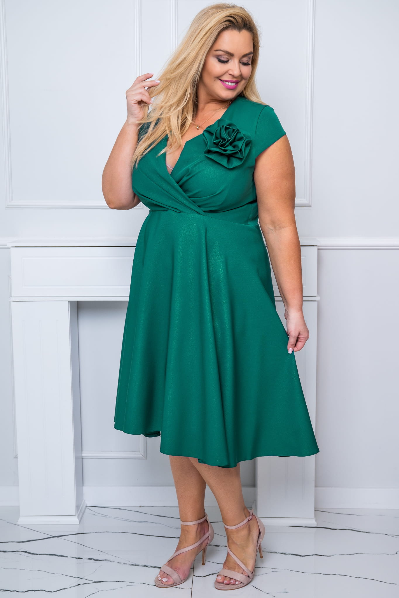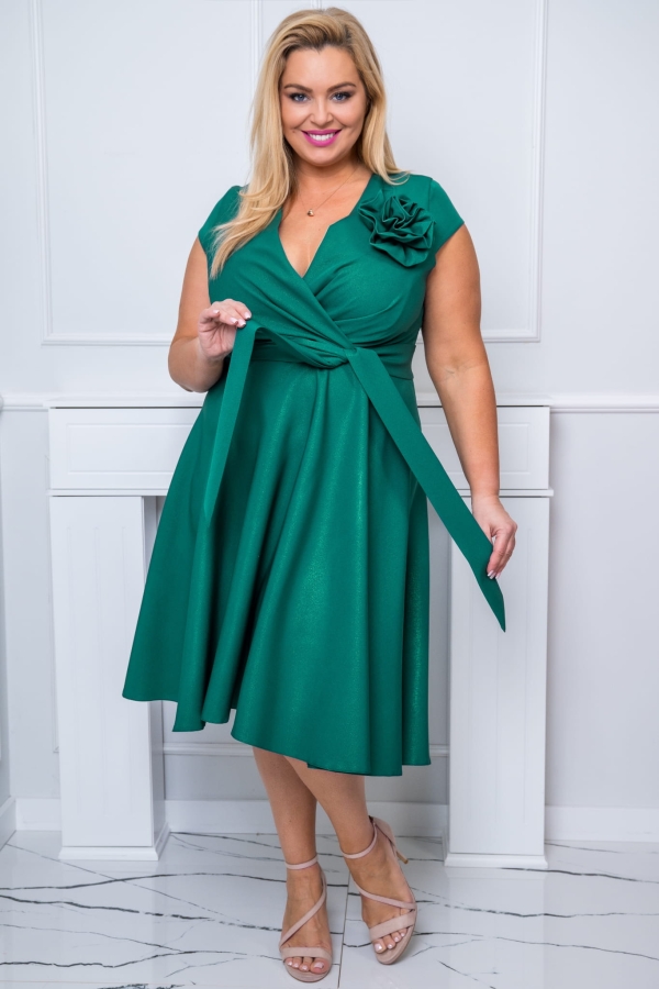NINA z kwiatem i paseczkiem to niezwykle kobieca sukienka wykonana z ekskluzywnej gładkiej tkaniny. Modny fason podkreślający kobiecą sylwetkę. Efektowne drapowanie z przodu, wysmuklający szyję kopertowy dekolt oraz lekko opadający na ramię rękawek sprawiają, że sukienka jest bardzo efektowna i świetnie dopasowuje się do sylwetki. Model sukni wysmuklający, zaprojektowany z myślą o sylwetkach PLUS SIZE